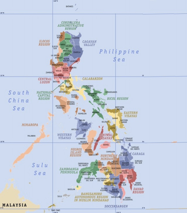 Ilocos Region Cagayan Valley Central Luzon National Capital Region Calabarzon Bicol Region Eastern Visayas Western Visayas Negros Island Region Central Visayas Northern Mindanao Zamboanga Peninsula Davao Region Caraga Soccsksargen Oriental Mindoro Occidental Mindoro Bohol Cebu Negros Oriental Negros Occidental Iioilo Capiz Davao Oriental Davao Del Sur Quezon Leyte Southern Leyte Samar Antique Bataan Albay Bulacan Batangas Aklan Masbate Laguna Cavite Rizal Abra Cagayan Almora Cotabato Lanao Del Norte Camarines Norte Isabela Tarlac Zambalas Cordlera