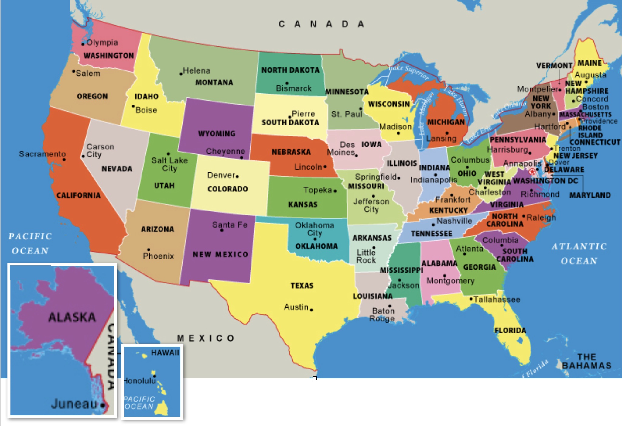 Washington Oregon California California Alaska Hawaii Nevada Arizona Utah New Mexico Colorado Idaho Montana Wyoming North Dakota South Dakota Nebraska Kansas Texas Oklahoma Minnesota Iowa Missouri Arkansas Louisiana Mississippi Wisconsin Illinois Tennessee Indiana Michigan Kentucky Alabama Georgia Florida South Carolina North Carolina Ohio West Virginia Pennsylvania New York Vermont Maine New Hampshire Massachusetts Rhode Island Connecticut New Jersey Delaware Maryland District of Columbia Virginia